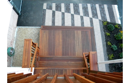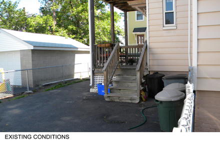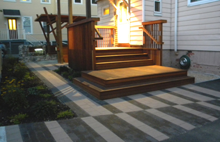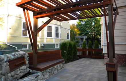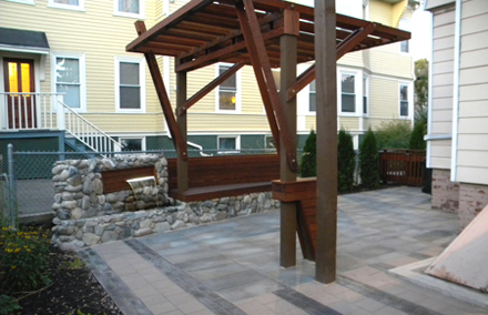 This project consisted of the design and construction of a new residential rear yard space. The existing site was predominantly asphalt and contained a deteriorating two story deck. The goals of the project where to create a semi-covered space for social events, restore and expand the existing deck, and create a softened landscape of plantings and paved areas throughout. To meet these goals the existing deck structure was kept and new structure added for an expanded platform. The new and existing structure were resurfaced with IPE wood and custom vertical railings were added. Alternating bands of dark and light toned pavers where used at the base of the deck and continued to the more private area of the yard. This private area contained a cantilevered pergola and a bench/water feature element made of wood and existing stone salvaged from the site.