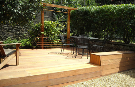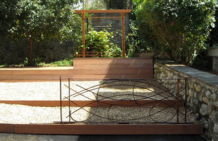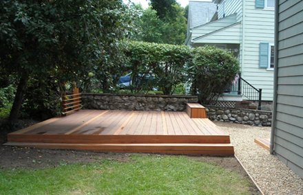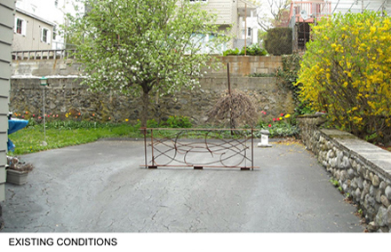 This project involved the design and construction of a series of terraced outdoor spaces located over an existing sloped asphalt drive. The goal of the project was to soften the existing asphalt landscape and create a series of warm, functional spaces that would be inviting as well as low maintenance. The main feature of the project was a raised deck in the rear corner of the site made out of mahogany wood, containing a trellis element at its rear (for an existing grape vine to cover) and an extruded bench/storage element at its front. To further soften and cover the existing asphalt drive, a series of cascading mahogany terraces, in-filled with pea gravel, where introduced as the drive continued downward to the street.